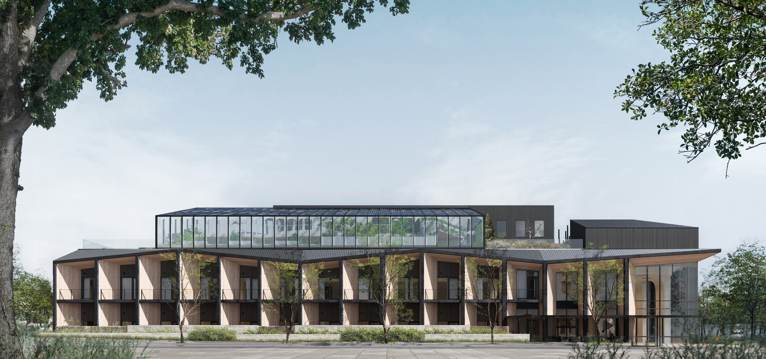 At the rooftop, a glass conservatory introduces warmth and humidity uncommon to the high desert—a respite those accustomed to the region's arid climate will especially value. The space is designed for lush plantings and seamless movement between indoor and outdoor bathing, while open air lounge areas and pools offer uninterrupted views west to the Cascade Range: the Three Sisters, Broken Top, and Mount Bachelor. Adjacent to the conservatory, freestanding structures rise to house more hotel suites and spa treatment rooms—a series of private spaces elevated above the roofline that extend the connection to the sky and distant peaks.
